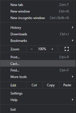 Si abres el menú principal de Google Chrome a través de los tres puntos en la esquina superior derecha de la interfaz verás la opción “Transmitir” o “Cast” que puedes usar para transmitir pestañas individuales del navegador o incluso todo tu escritorio a un dispositivo Chromecast que esté conectado en tue red actual. En algunos sitios de video en streaming, como lo son Netflix o YouTube, el contenido de video se transmitirá en lugar de la pestaña o el escritorio. Funciona bien para mostrar presentaciones, fotos, etc.