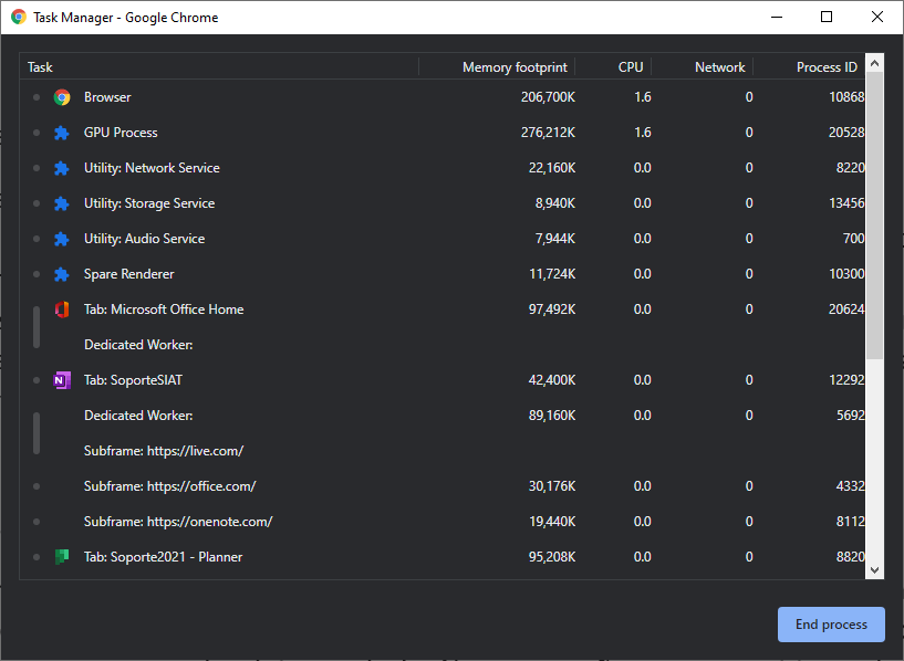 Quizás nunca te hayas dado cuenta de que Chrome tiene su propio administrador de tareas que puede ser útil para diagnosticar problemas del navegador y monitorear el rendimiento de Chrome. Para acceder al administrador de tareas, abre el menú de Chrome y luego elija Más herramientas/More tools y Administrador de tareas/Task manager (o simplemente presione Shift + Esc). Puedes ver cuánta memoria, tiempo de CPU y ancho de banda de Internet está utilizando cada una de tus pestañas abiertas, así como cualquier proceso en segundo plano.