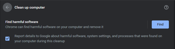 Chrome viene con su propio escáner de malware que puedes usar si experimenta velocidades de navegador lentas, ves muchos anuncios emergentes o notas cualquier otra cosa sospechosa. Haz clic en Configuración/Settings y navega a la sección Avanzado/Advanced, elige Restablecer y limpiar/Reset and clean up y luego da clic en Limpiar computadora/Clean up computer para buscar amenazas. Una vez que se haya completado el análisis, Chrome informará sobre sus hallazgos.